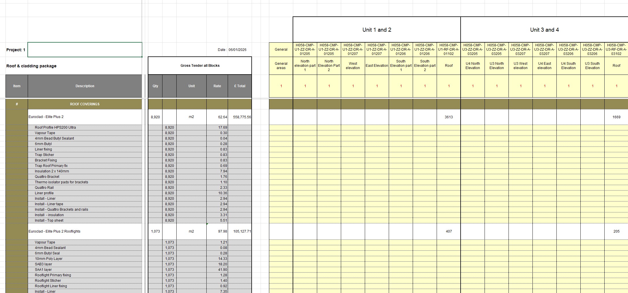 Each item is built up methodically, providing full visibility of quantities, rates, and allowances across the façade package.